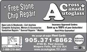 Paint Touch Up Vandalism RepairsAuto & Truck Mirror Replacements Are You About To Return Your Leased Auto Or Truck, Wondering What The Dealer Is Going To Charge To Fix Those Small Cosmetic Repairs? ACROSS CANADA Are Experts In Lease Returns And Will Save You Money!! Call Or Stop By Today For A FREE Vehicle Inspection! Hamilton & Niagara Area! A broken or cracked windshield is not just unattractive, it also can be unsafe! Let ACROSS CANADA Auto Glass trained installers replace your damaged glass with state of the art technology using OEM-approved materials and processes. Whether it's your windshield or any automotive glass need, at ACROSS CANADA Auto Glass it's guaranteed for LIFE!ACROSS CANADA Auto Glass works with all major insurance companies. Just bring in your policy information. We'll prepare the paperwork for you and bill your insurance company directly.SEE CLEARLY, DRIVE SAFER AQUAPEL® AT WORK As the photos demonstrate, Aquapel treated glass provides clearer vision in the rain.