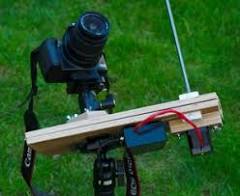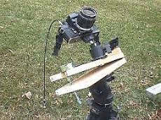 Build a Barn Door Tracker The camera platform carries the camera and finder scope. It is hinged at one end and supported by the drive board at the other. Where the platform rests against the drive board, a hard strip of Nylon provides the "sliding point of contact." The camera bracket is made from 0.125" × 2" aluminum. A commercial ball head is mounted on the bracket to hold the camera. The ball head is the single most expensive component in the project, costing $40 — more than I paid for the stepper motor and gearbox. Careful mail order shopping will save you a lot of money on the ball head; I bought mine at a local camera store. The camera bracket can be mounted anywhere on the camera platform, although mounting it near the hinged end of the platform will provide the best stability. Also, you should select a location where the mount is least likely to interfere with your ability to look through the camera's viewfinder. I've already decided to mount at least one additional bracket on the lower part of the platform to make it easier to use the viewfinder when the camera is pointed at the northern sky.