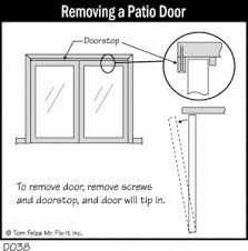 This may set the door back on the rail; if it does not, remove the door and rehang it as described below. The rollers of doors that are difficult to slide also may need cleaning or replacing, or else the track may require repair. Methods for removing sliding patio doors vary, and so do procedures for removing rollers. With many models, removing the door is done by sliding it toward the middle of the track, then lifting the door to push its top edge into the upper track as far as it will go. This raises the bottom edge of the door clear of the rail, allowing the door to be tilted from the bottom toward the inside of the house. The door can then be lowered to free it from the upper track. On other doors, removal is by detaching a strip of molding at the top of the door frame. Then the door can be tilted toward the inside from the top and lifted clear of the rail. To remove rollers from some doors, it is only necessary to loosen one or more obvious screws, including the adjusting screw.