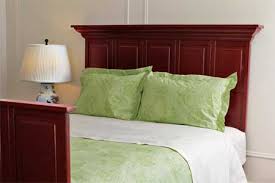 Clamp a saw guide to the attached doors. Using a circular saw, follow the guide to cut off all five bottom panels. Using a drill/driver and 1½-inch screws, attach a length of 1x3 across the five bottom panels to create a solid footboard. Create the Crown Molding Top Mark the base of the crown molding to the width of the headboard. Position the crown upside down on the deck of a miter saw, braced against the fence and deck the same way it would be positioned against a wall and ceiling. Cut the ends of the molding at 45 degrees for outside corners. To create returns for the mitered ends of the crown, cut two more pieces of molding 1 inch wide, with a straight cut on one side and an outside miter on the other. Put the three pieces together into a three-dimensional top, joining the returns to the ends with wood glue and 4d finishing nails. Attach the Top to the Headboard Lay the five connected headboard panels faceup on a worktable. Dot the top rail with wood glue wherever the doors meet.