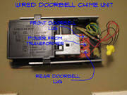 unit down from the wall to get at them. These are the wires that complete the connection between the doorbell buttons and the transformer, forming a completeWhen the doorbell button is pushed, power flows from the transformer, through the button, and through the chime mechanism, activating a solenoid electromagnet which moves a steel rod. The rod strikes the metal chimes, producing the notorious doorbell "ding" or "dong"... or activates a Remove the electrical tape and/or wire nut on these (hidden) second wires. (Note that only one of them is connected to the transformer, so keep the bundle together or you will have to probe each of them in the following test.) voltmeter set to the lowest AC setting above 20 volts, touch one probe to the second wire bundle and the other to the wire labeled Trans... disconnect it from the doorbell. If there is a reading of 10 or more volts, the transformer is OK. final test of the doorbell unit, touch the second wires to the front and/or rear