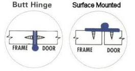 (It bears noting, though, that this type of hinge will work only on a frameless cabinet with full overlay doors). Decide how you want the hinge to mount to the cabinet and door Surface-mount hinge: A hinge that does not need a hole or mortise to be drilled in the door or cabinet in order to mount it. It simply mounts to the surface. Mortised hinge: A hinge that requires the cutting of a mortise or recess in the door or cabinet to fit the hinge leaves for proper mounting. No-mortise hinge: A style of surface-mounted hinge that screws directly to the cabinet and the door without any mortises or special recesses being cut into the surfaces. Wraparound: A style of hinge where the leaves are formed to wrap around the edge of the door and/or the cabinet side or face frame. A partial wraparound hinge will wrap around the door and have a plain flat leaf for the cabinet so it can be used on a frameless cabinet. A full back-to-back wraparound hinge will wrap around on both halves of the hinge so it can be used on a face-frame cabinet.