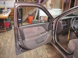 Start with the window fully up. With a Phillips screwdriver, remove the two screws under the inside edge of the door, the two screws under the door handle, the screw underneath the light, and the screw underneath the mesh cover in the middle of the door. Press the two pins on the outer edge of the door with a flathead screwdriver. Pull the loosened pins out of the door. Remove the trim around the interior door handle. Wrap the end of a flathead screwdriver with electrical tape. Insert it between the pull handle and the trim around the interior door handle, and press down. At the same time, pull on the outer edge of the trim at the same end until the clasp that holds it comes loose. Keep prying toward the other end until all of the trim is loose. Pull the door handle, as if you are opening the door, and slide the trim off. Slide the flathead screwdriver or your pry bar around the bottom edge of the door panel. At the bottom, the panel is held on by plastic clips that will pop loose.