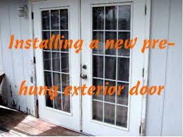 If you have a choice, prehung doors are very easy to hang. Hinges are already installed, and holes are pre-cut for doorknobs and locks. Door jambs are in place and fastened together. The entire assembly is fastened into place, trim installed (although brick mold us usually already in place as well) and the door finished with paint as necessary. The photos used here are of a French door being installed, but again there is little difference between that and a regular door or an entrance door with a sidelight.