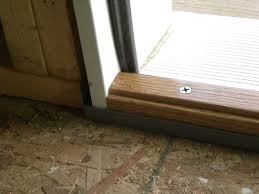Beneath these caps are brass screws that adjust the threshold up and down. On some door thresholds the screws are always visible. Tuning them in one direction will raise the threshold the other direction will lower it. Steps for proper door threshold adjustment Before attempting any adjustment, close the door and observe the rubber sweep on the bottom of the door. It should be barely touching the adjustable part of the threshold. This can be ascertained by placing a light source on the opposite side of the door and looking for light seeping under. Alternately a piece of paper may be placed over the threshold of the door while it’s in the open position and then closing the door over it. If light is visible under the door or the paper moves easily along the bottom of the door, the threshold is not fitting tight enough. If the paper is torn when closing the door or the door is too difficult to close the threshold may be too tight. The bottom of the door should have some type of sweep (rubber gasket or fins) that are slightly compressed as the door is closed over the threshold.