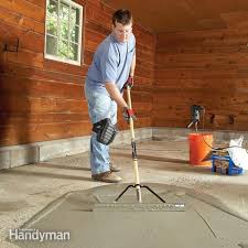 Pour the mix into a puddle on the slab and immediately spread it (Photo 7). Work quickly and carefully, blending each stroke into the previous one until you get a nice, uniform look. Smooth the resurfacer along the side walls by pulling the squeegee toward you. As you reach the edge of the door weather strip, use your steel trowel to gently blend the resurfacer against the weather strip. You can remove the excess with the trowel and drop it into a bucket. To apply a nonslip texture, lightly drag a clean push broom in one direction across the still-wet material (allow no more than five minutes of setting time before applying the broom finish).
