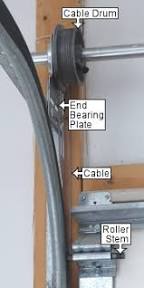 On line sources suggest a higher price of over $700 and that you will save $500 or more by replacing springs yourself. This is simply not true. To find the cost for replacing springs in your area look for a reputable company through Yelp or the Better Busienss Bureau. If clicking a site's BBB logo doesn't take you to the BBB site, we advise purchasing your springs from a different company. These instructions are for doors with cable drums and cables that look similar to those in the picture below. The next part beyond the end of the spring assembly is the cable drum. The drum is cast aluminum alloy 4" in diameter and 12.6" in circumference around the flat portion. Just beyond the cable drum is the end bearing plate. The cable unwraps off the back of the drum between the drum and the garage wall or jamb and travels down alongside the door, inside the track brackets and behind the roller stems as shown. If your garage spring assembly is different from this, parts of these instructions may be helpful, but other parts may give dangerous, inaccurate directions which could cost you a lot of time and money should you attempt to replace the springs using standard instructions.