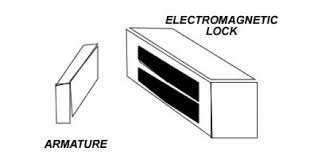 Basic Magnetic Door Lock SystemElectromagnetic LocksElectromagnetic locks are widely used in commercial and industrial applications. The lock is usually mounted on the header above the door and the armature is usually mounted on the door (see drawing below). Different arrangements can be made for inswing or outswing doors, and different holding forces, monitoring switches, and other variations and options are available. In this article I will discuss only the basics. As with any locking system, use of electromagnetic locks may be restricted by local authorities such as your local building inspector and/or fire marshall. It is wise to check with these authorities before installing an electromagnetic lock. System OverviewTo install the most basic electromagnetic locking system on an out-swinging hollow metal commercial door and frame you need the following: The electromagnetic lockA way inA way outA power supply The electromagnetic lock is an appliance. It unlocks when you shut off the power.