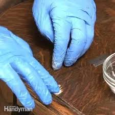 If you can still see the damage, try drawing the grain lines with a colored pencil, or even use the tip of a knife to score the damaged area slightly to imitate the grain pattern. Rub some wood putty over it and sand it lightly with 180-grit sandpaper. Spray the area lightly with a single coat of aerosol lacquer. If you can still see the area, drag the tip of the marker over the lacquered area and spray it again. Scratches and Gouges You can sand out many scratches on veneer doors. Attach 100-grit sandpaper to a hand-sanding block. Sand across the scratch parallel to the grain, back and forth gently until the scratch is gone. Carefully monitor the sanding process to prevent sanding through the veneer. If the grain lines around the scratch begin to disappear, stop sanding immediately. Apply a matching putty stick to the remaining parts of the scratch, followed by a matching oil stain. Spray the area lightly with one coat of aerosol lacquer. Repair deeper gouges with wood putty. This type of putty is specific to species.