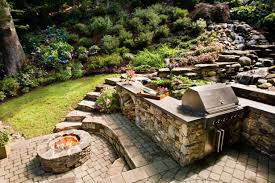 The fire pit and patio is made of Belgard pavers. This fireplace, constructed with Belgard products and featuring a hearth and mantel, brings an indoor feel to the outside kitchen and entertainment area. Guests can get their drinks and food at the bar and take them over to the fireplace on this expansive patio. A fireplace is located to the left of the cooking area and amid lovely surroundings in this award-winning Mexico City design by landscape architect Mario Schjetnan. Image courtesy of Hector Velasco. A built-in grill and above-ground fire pit combine to create an outdoor entertaining area for a new house by Edward Andrews Homes in metro Atlanta. These homeowners have it made in the shade, with a built-in outdoor kitchen and fire pit by Landscape Plans Plus that makes their yard ready for entertaining. The glow of a fireplace, lighting and candles create a gorgeous setting for this outdoor kitchen. Fire pits are popular in several kinds of outdoor kitchen and bar areas, including this curvy space by Southview Design with a tiki theme and in-ground fire pit.