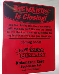 (The sign on the door says Sept. 1) Answer: "The Portage Menards store located at 879 Mall Drive is currently running close-out sales and will be closing soon." Q: Why is it closing? Not cost-effective to renovate? A: "In an effort to provide all the latest, greatest home improvements products for all the loyal Menards shoppers in this area, we replaced an older, smaller store in this market with a brand new Kalamazoo East Menards store located about 15 miles away at 5300 Gull Road in Kalamazoo. The new store was built in our largest format and will have several great departments, a full-service lumberyard featuring a covered warehouse, beautiful garden center, appliances, pet and wildlife section, and even a line of convenience groceries for a one-stop shopping experience." Q: Was that the plan when Menards decided to build the new store? Q: When will the new store open and how large is it? (The sign on the old store indicates the new Kalamazoo East store will be a mega-Menards.)