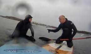 I was on the wave. Don’t do it again. Do it again and I will put you in f*****g hospital and that’s a promise. ‘Don’t act like a t**t in the water.’However, despite Mr Brown apologising, the man continues to hurl abuse and exclaims: ‘F*** off back to England you ****.’ Mr Brown pointing out that he is in fact from Cornwall, the man – who appears to have a strong Liverpudlian accent - responds: ‘I was born then be heard telling the man it ‘gives him no more right’ but is met by a response of ‘f*** off’ by the SUP rider who then paddles off. In the video footage, the SUP boarder, right, can be heard shouting: 'You drop in on me like that again and you won't f*****g surf here again. It's my wave, keep your f*****g eyes open' The incident, which occurred off Summerleaze Beach in Bude, Cornwall, has left Mr Brown ‘wary of going back into the water’.He said: ‘I think he’s bang out of order for the way he spoke to me and the localism he used as well.‘