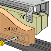 Attach the interior handle and tighten the setscrews. Stabilize the assembly by drilling a pilot hole and driving a ½-inch screw through the outside face of the base track wherever it meets a vertical frame member. Repeat the process on the inside face of the header. Center the screws on the aluminum extrusions to avoid hitting the glass. Pull the thin vinyl sweep out of the drip rail and set it aside. Cut the drip rail with a hacksaw to match the width of the door. Round off the ends of the cut with a file. Slide the vinyl sweep back into the groove in the rail. Crimp the ends of the groove closed with pliers to hold the sweep permanently in place. Trim off its overhanging end with a utility knife. With the vinyl sweep pointing down, hold the drip rail against the inside bottom edge of the door. Drill 7/32-inch pilot holes into the doorframe through the elongated mounting holes and low enough to avoid hitting the glass, which sits ¼ inch into the trim.