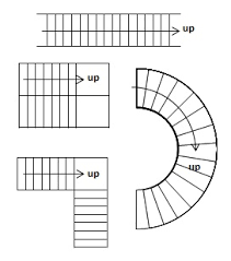 Then there's sweeping staircase style. Top row from left ... sink, sink with draining board, dish washer. Bottom row from left.. oven, cook top, refrigerator. The solid line here represents the work top in the kitchen with the dotted line representing the cabinet above. No prizes - washer and dryer HWT - Hot water tank HW - Hot water heater Top row from left... bath, corner bath, shower. Bottom row from left... sink, double sink, toilet, bidet. Showers can often be different sizes than shown here but will always appear with a crossed lines through the center. Here's a little arrangement for you. The sofas and chairs are kind of obvious with the coffee table in the middle. The side table has a lamp on it and the TV is labelled. Dining tables - a round one for four and a rectangular one for six. These tables show chairs in the pushed in position so remember to look for clearance around the table so that people have room to come and go from the table.