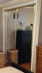 Step 7: Remove paint from mirrors. Even with my copious taping and cover-up job, we still got some flecks of spray paint on the mirrors. Use a razor blade flat against the mirror to skim off dried particles of paint. Put the top and bottom tracks back in and maneuver each door back on track. Step 9: Rejoice and admire! Why not buy some new doors? No, really, we’re not mainstream. And I suspect you aren’t either since you’re searching google for ways to make your 80’s gold sliding closet doors look nice for cheap. * We practice radical insourcing for most things that other folks would pay someone to do. It all part of our extreme (sometimes hilarious!) frugality. We’re busying saving money so that in 2017 we can quit our city jobs and move to a homestead in Vermont. If you’d like the story from the beginning, check out our About page. And good luck with the sliding closet door project! Don’t hesitate to ask questions in the comment section. W