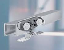 To reduce air- and smoke-tightness and sound insulation, brush seals are commonly used. Sliding doors in a modern wardrobe. The 'top hung' system is most often used. The door is hung by two trolley hangers at the top of the door running in a concealed track; all the weight is taken by the hangers, making the door easier to move. At each end is a track stopper to absorb any impact made if the door is slammed and to hold the door in the open or closed position. All top hung sliding door gear systems have a maximum weight limit per pair of trolley hangers. When specifying a suitable sliding system the estimated weight of the door is a critical factor, although most suppliers of sliding door gear can advise on door weights As the door is hung at the top from two points, it also needs a bottom track/stay roller[5] to prevent it from swinging sideways. The most common type is called 'clear threshold guiding', a floor-fixed plastic guide about 60mm wide which is fixed below the door at the midpoint of its run.