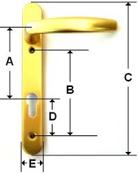 glass door knobs 40mm B - Length : 210mm C - Width : 30mm F - Between Screws : 165mm uPVC Door Handle No. 7 B - Length : 238mm E - Bottom Screw : 30mm F - Between Screws : 210mm uPVC Door Handle No. 8 B - Length : 240mm E - Bottom Screw : 25mm F - Between Screws : 216mm uPVC Door Handle No. 10 B - Length : 220mm F - Between Screws : 122mm uPVC Door Handle No. 11 - **High Security** C - Width : 35mm