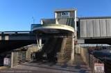 This same platform wall has a series of 8 BART TVMs for buying tickets to all BART destinations. To leave the station, beyond the end of the people mover platform (enclosed by more glass windscreens) is a bank of faregates. Here passengers pay to enter or leave the BART system (the Oakland Airport Station has no fare gates) with a $6 additional surcharge to pay for the OAK connector deducted from their fare cards on top of their regular distance-based fare. A passenger just wanting to ride the OAK Connector (such as connecting from Capital Corridor Trains) must buy a $6 farecard at the OAK faregates, walk through the station and down the BART platform to the street level exit and have $6 deducted when they leave BART's fare control area at the same station! From these faregates a short enclosed pedestrian bridge with mesh walls leads across San Lendro Street and the southbound BART track before leading to a landing with a staircase followed by a set of two escalators with a staircase in between down to the extreme southern end of the BART platform (there are fences before the platform starts), as soon as this arrives on the platform passengers are completely exposed to the elements and the building of the BART to