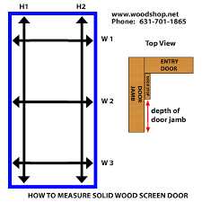 typically, it is hung in front of the door stop. Once you’ve checked and double-checked your measurements, choose the largest width and height – you or your hired professional will trim the excess wood at the time of installation. After you’ve determined the size of your existing opening, deduct 1/4” inch from the WIDTH for clearance and up to 1/2" for the HEIGHT. It’s important to include this deduction in the measurements you provide us; we do not make the deduction. Make sure the entry door handle does not protrude into the space for your wood screen door hardware. It’s important to ensure there’s enough clearance for specialty hardware handle sets. Don’t let the arch top scare you, correctly measuring the door is easy. Just like a standard door, you’ll take three horizontal (width) two vertical (height) measurements, in addition to measuring the door jamb thickness. Looking at the diagram for guidance, the three horizontal measurements are: