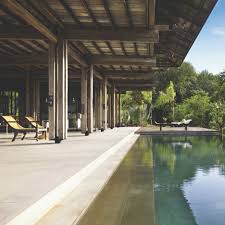 These timber poles are beautiful hardwood. Instead of new timbers, we decided to reclaim the utility poles and work with them." Standard utility poles sourced from a single timber yard were used to construct the building's main frame and roof trusses. Structural columns are formed by fixing four of the wooden poles to raised steel bases that also help to protect the timber from being damaged by termites. Traditional scarf joints were used to join sections of the poles together, creating beams of sufficient length for the framework that supports the roof. Boards used for the flooring and wall cladding were sourced from a former jetty in Penang. The architects also found shingles for the roof on an old airport in the same location. Dark steel was used for details including door and window frames, to create a modern counterpoint to the patinated wooden surfaces. A short set of steps leads from a path up the hillside onto the concrete slab of the ground floor, which looks out over a pool towards the sea.